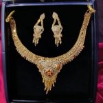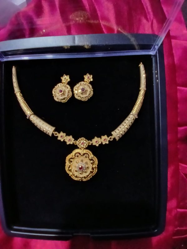 🌟 The necklace features an exquisitely detailed centerpiece with traditional motifs and subtle stone embellishments that add depth and character. The premium gold plating gives it a rich, antique finish that enhances its royal appeal, while the matching earrings perfectly complement the overall design. 💛💫